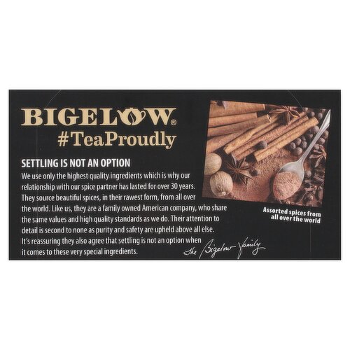 Protected in Foil To maintain the integrity of our carefully selected ingredients, we wrap each tea bag in a foil pouch to ensure the fullest flavor, freshness, and aroma. Our Family is Proud of Our Recipe Each ingredient below has been carefully selected by the Bigelow family to deliver an uncompromised quality tea experience. Our Spiced Chai is a perfect blend of rich black tea and flavorful bold spices. Try it on its own or with a little milk and sweetener.